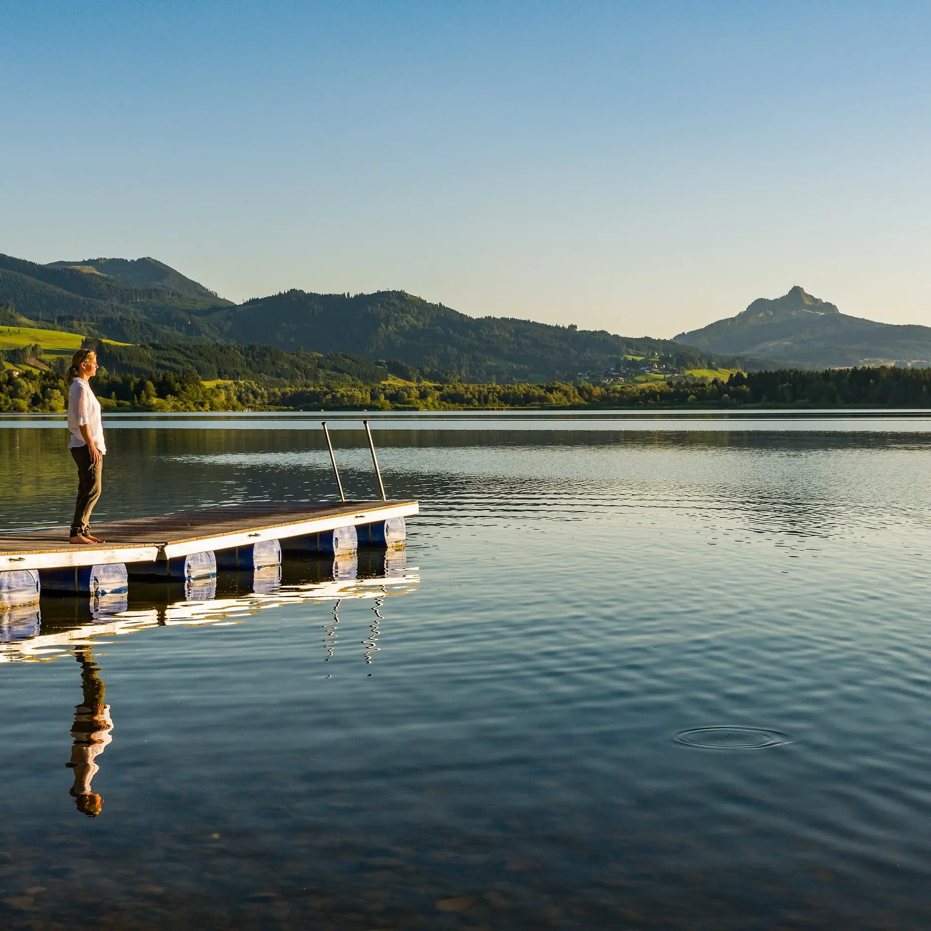 In der Allgäuer Voralpenlandschaft von Oy-Mittelberg liegen zwei Seen und zwei Weiher. Der größere ist der Rottachsee, danach kommt der Grüntensee, der Schwarzenberger Weiher, der berühmt ist für sein warmes Moorwasser und der Sticher Weiher.