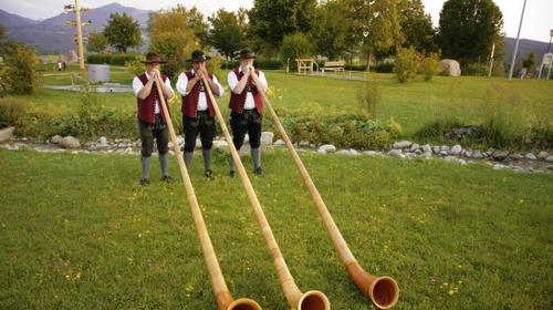 Das Alphorn wird erklärt. Bau, Geschichte und alles wichtige zum Alphorn, ein kleines Modell ist zu sehen.